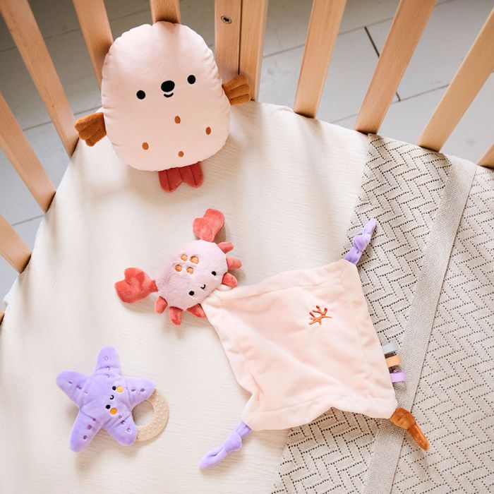 Immerse yourself in the magical world of this newborn gift set «Océan» in beautiful soft peach. This lovingly designed set for your newborn's and baby's first months includes two soft plush toys and an adorable teething ring that makes teething a delight. The cuddly seal (22x5x20 cm) and the cute crab baby comfort blanket (41x4x37 cm) are the perfect companions for little explorers. The violet starfish teething ring (13x4x12 cm) is ideal for encouraging playful teething. With this baby gift set, every moment becomes a small adventure – perfect for cuddling, playing, and discovering!