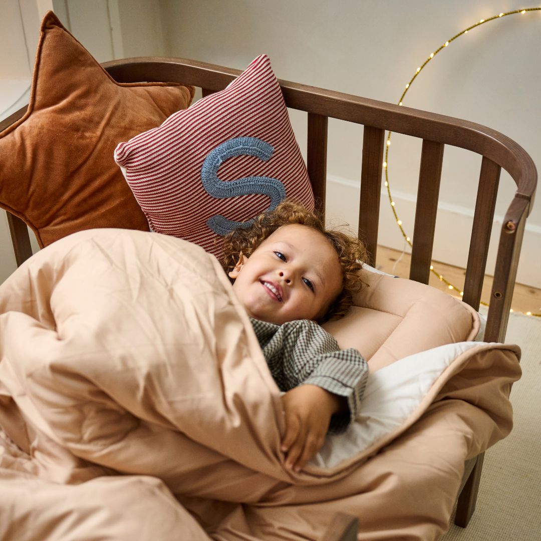 Enhance your child’s room with this charming green canopy, specially made to fit our «MAISON» house bed in size 90x200 cm. Crafted from 100% organic muslin cotton, the fabric has a naturally crinkled texture and ties securely to the bed frame with fabric ribbons. A lovely way to create a calm and cosy space for rest and quiet moments.