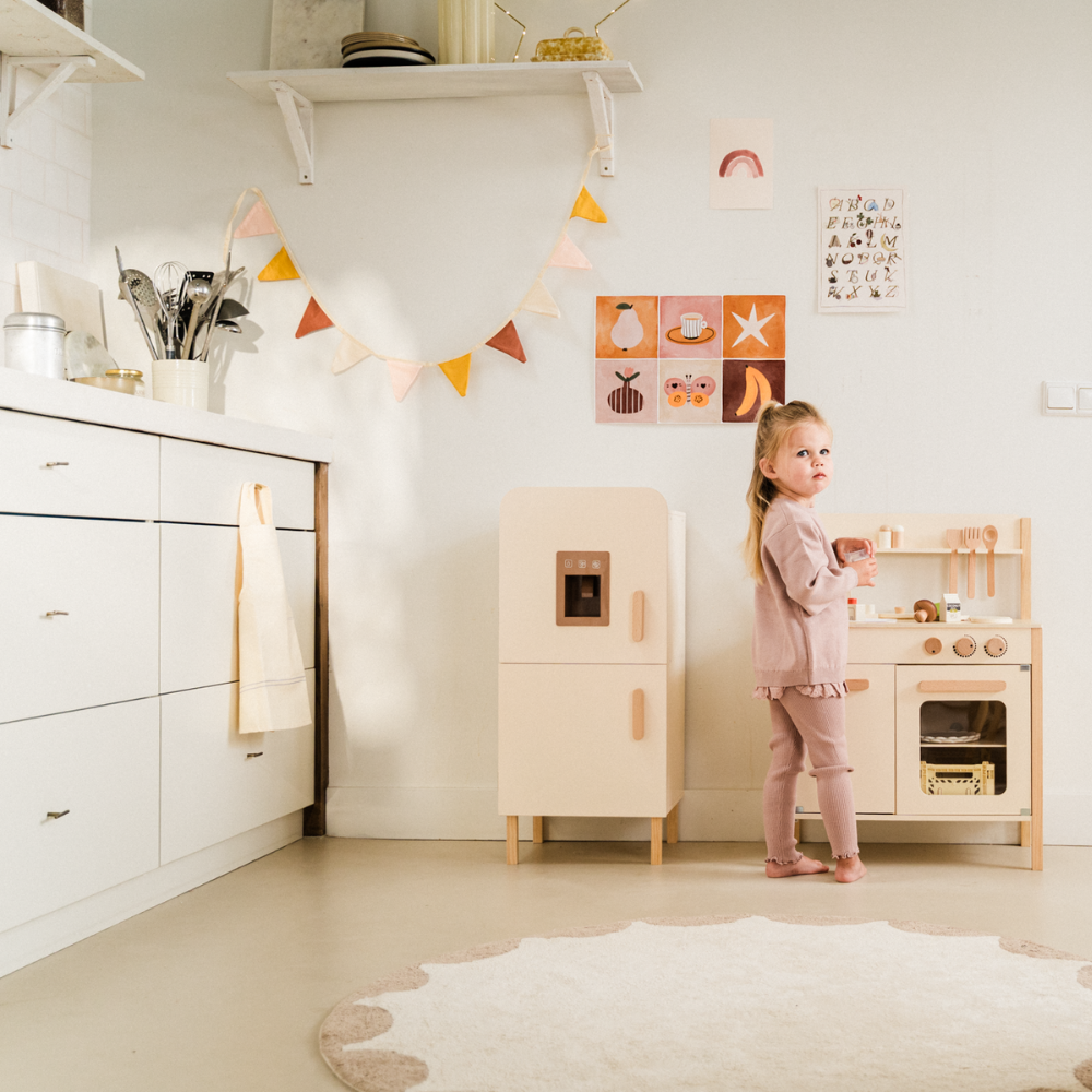 Be inspired by these toddler room ideas! Beige tones, a pink toy kitchen, and wooden toys for toddlers create a mix of style and playfulness. The soft rug completes the look—A perfect space for creative play, cosy moments, and inspiring kids' room decor i